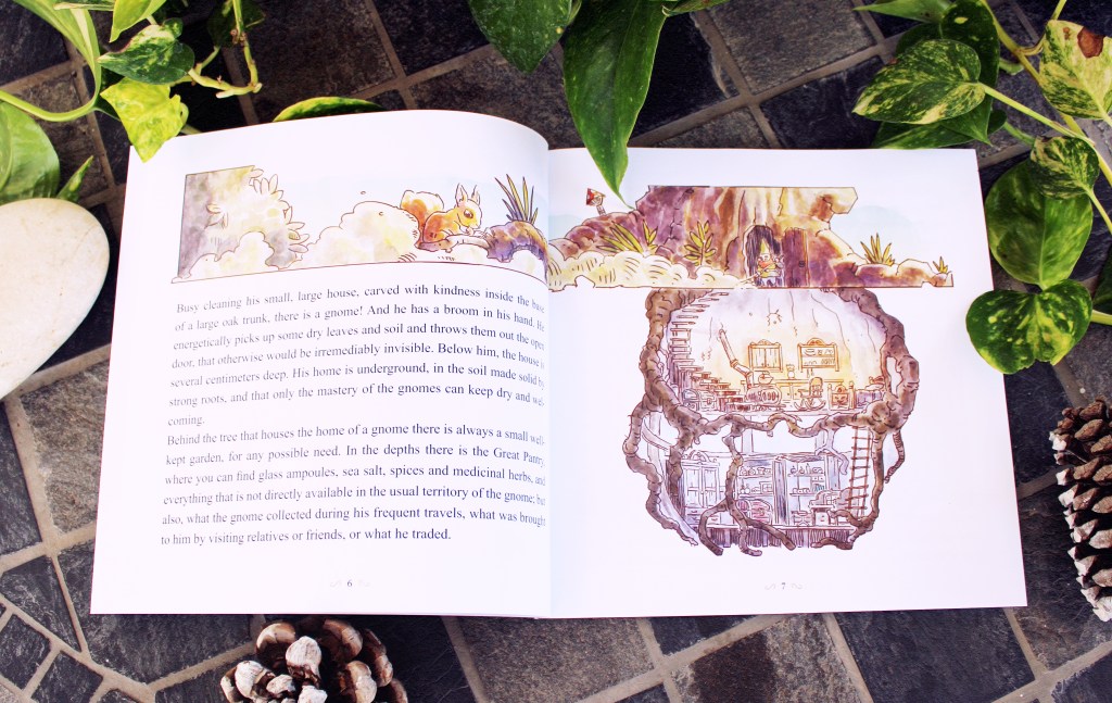 “But what is a gnome? It is not clear to me. I can say, however, that this one is known among his people by the name of Ulmo. He has a thick red beard covering his rounded cheeks. Gray eyes are surrounded by deep wrinkles, but the rest of the skin is very smooth like that of children when they laugh heartily. He is as tall as a small squirrel and wears sturdy forest-coloured clothes so that he cannot be seen when he doesn’t want to. Anyway he has arms and legs, as I believe you have too, reader.”